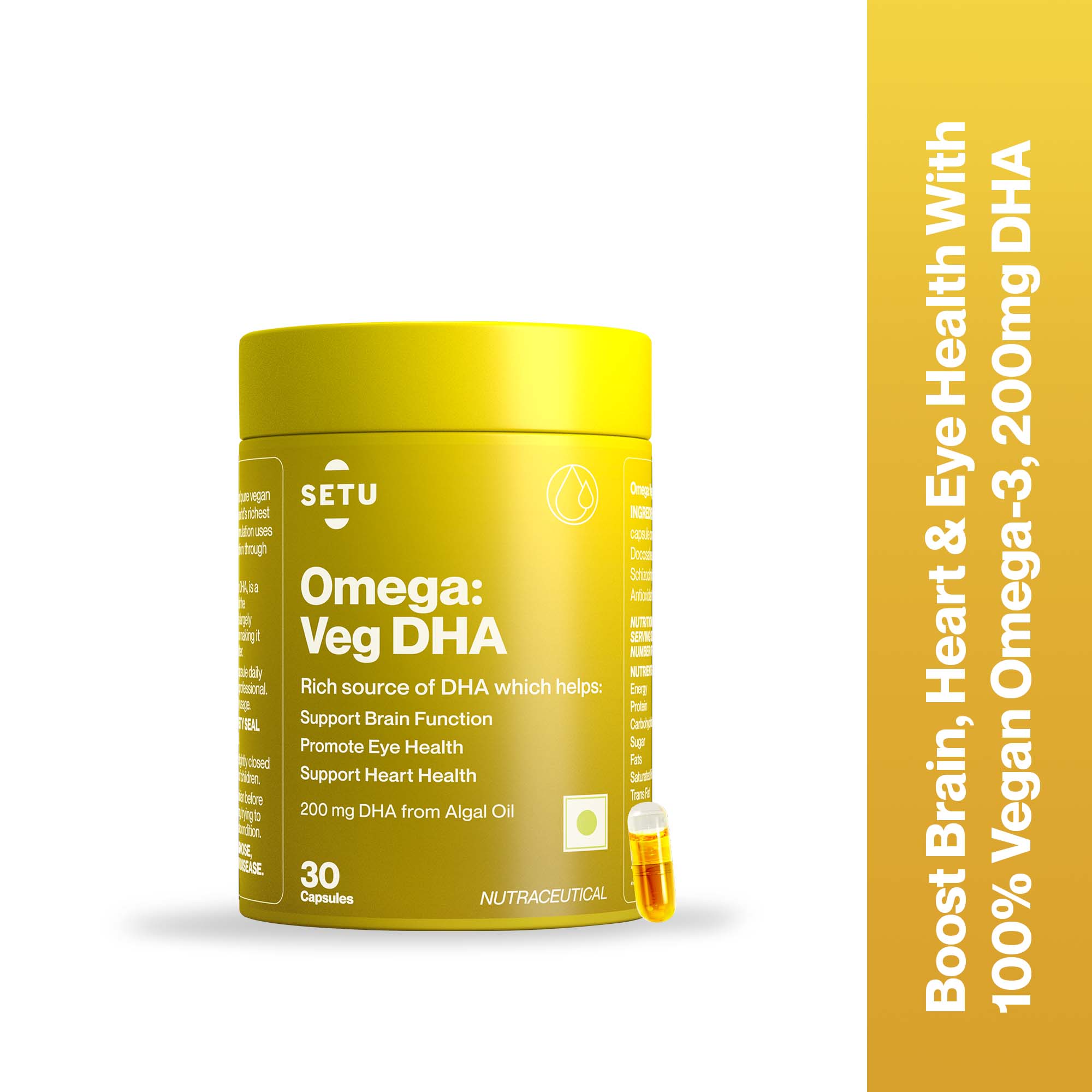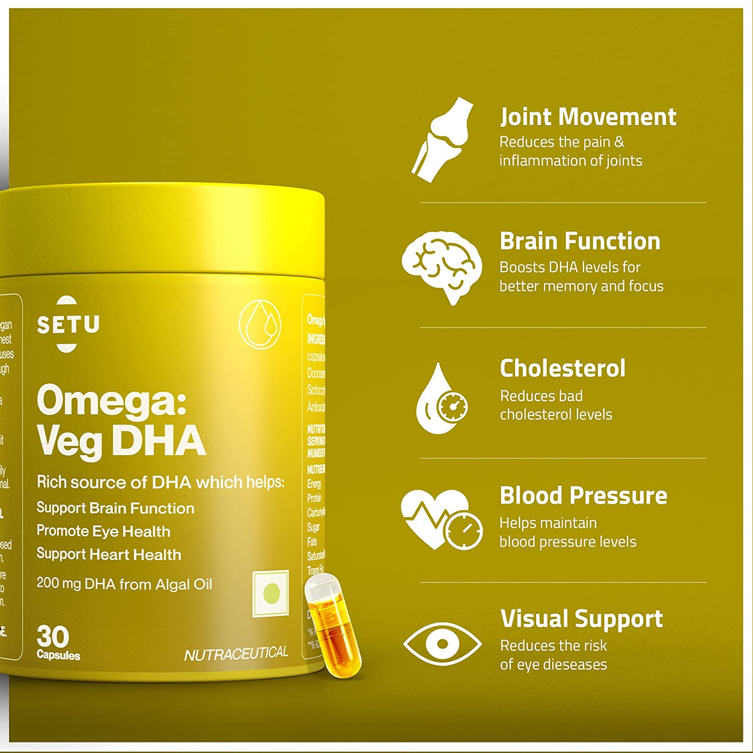 100% VEGETARIAN OMEGA 3 FOR HEART & BRAIN: You dont need to turn to fish oil supplements to get Omega 3. Presenting our Veg Omega 3 capsules that come from marine vegetarian algae with the highest concentration of DHA to maintain heart health lower blood pressure boost brain health and improve focus and memory among other functions.SUPPORTS JOINTS & EYE HEALTH: Suffering from knee pain? Fret not. Our veg omega 3 supplement for men and women provides relief from stiffness swelling and discomfort in joints. Apart from taking care of your physical strength our booster supplement also supports eye health improves vision and reduces fatigue and dryness.