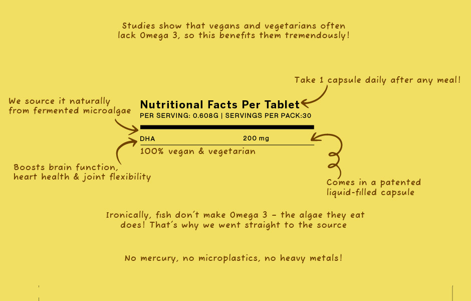 FISH-FREE; NO AFTERTASTE & BURPS: Our vegetarian Omega 3 capsules provide the same benefits as traditional fish oil capsules without an unpleasant fishy aftertaste smell and burps. Particularly for vegan and vegetarian people who dont get enough DHA our veg omega is the right choice to retain those vital nutrients that you have been missing out on till now.