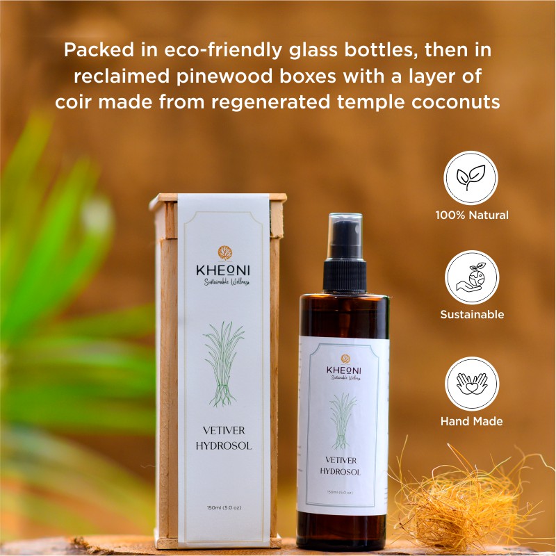 Nature's Stress Buster for Skin and Soul, Kheoni's very own Vetiver Hydrosol. It nurtures tranquility, balances emotions, and enhances skincare. The Hydrosols range is curated specially for an easy-to-use and beneficial purpose of incorporating sustainable skincare into everyone's routine!
