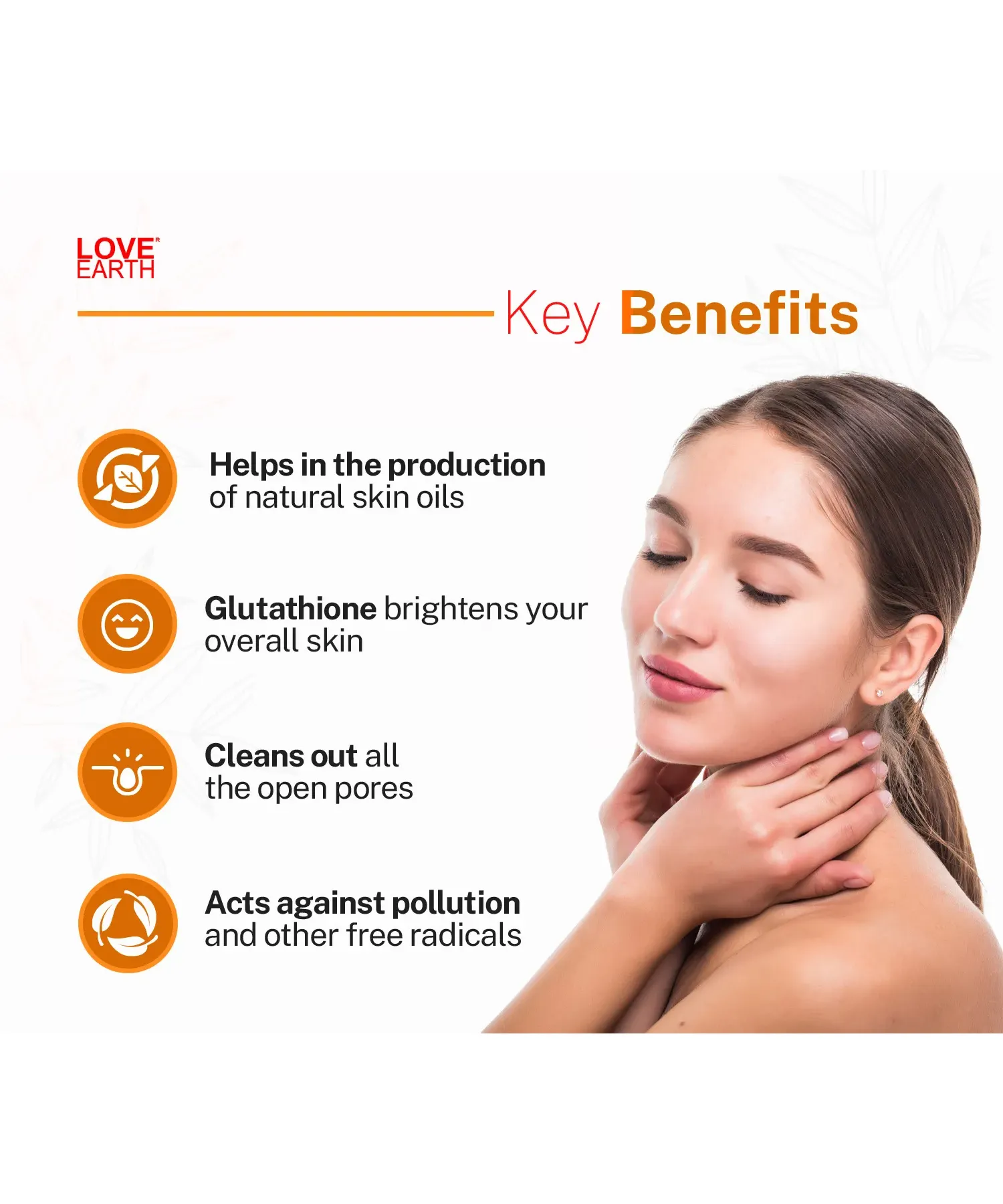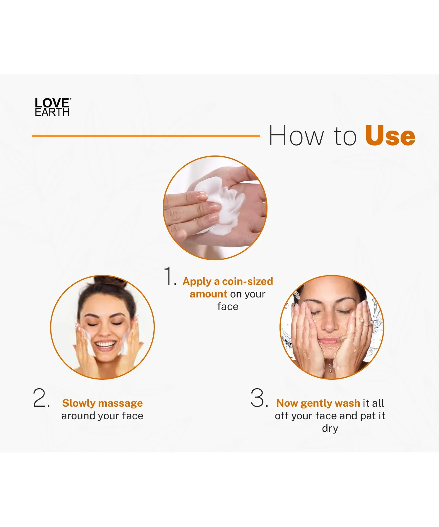 1. Apply a coin-sized amount of the vitamin C and glutathione face scrub from the Love Earth onto your face.2. Slowly massage in a circular motion clockwise and then anti-clockwise around your face. Then slowly finish the massage off in an upward motion.