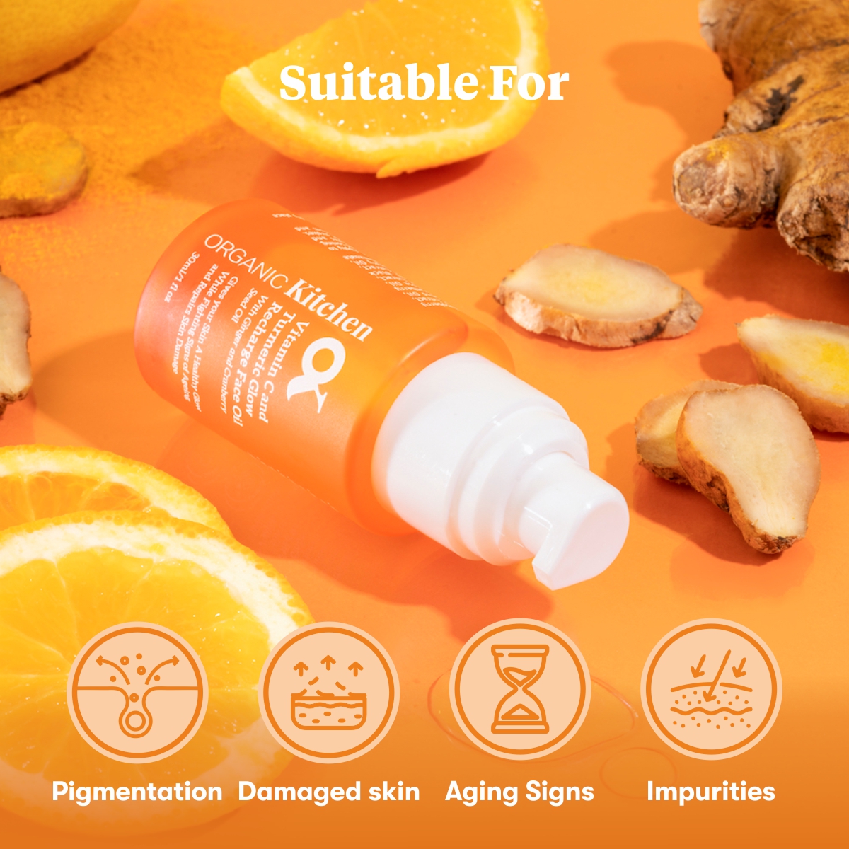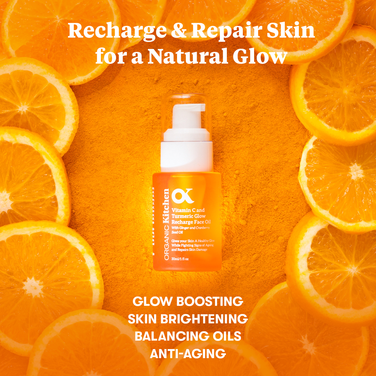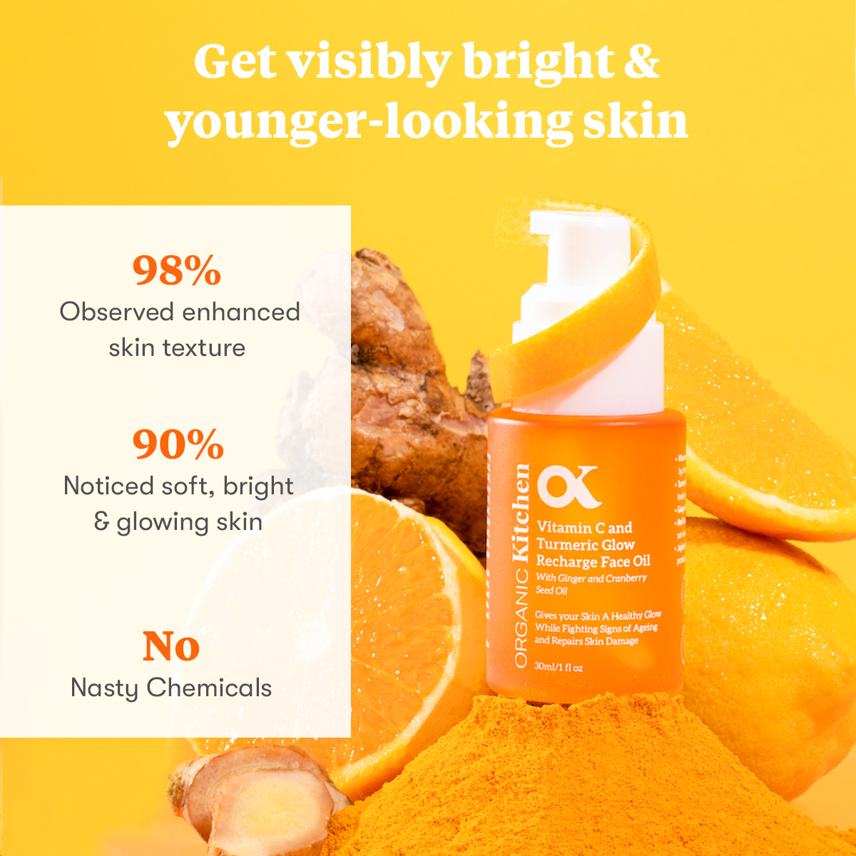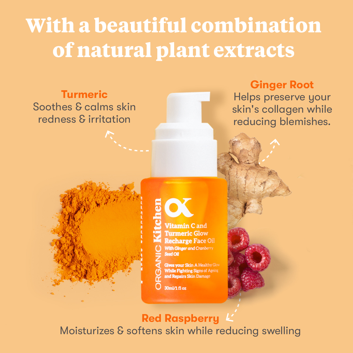 Restore the natural glow of skin with bright appearance while protecting it from sun damage with Vitamin C & Turmeric Glow Recharge Face Oil. This face oil visibly brightens skin for exceptionally soft and young look. It is a unique blend of ginger root, red raspberry, and jojoba oil whivh naturally protects skin from sun damage, balances sebum production while imparting a radiant glow to your face.