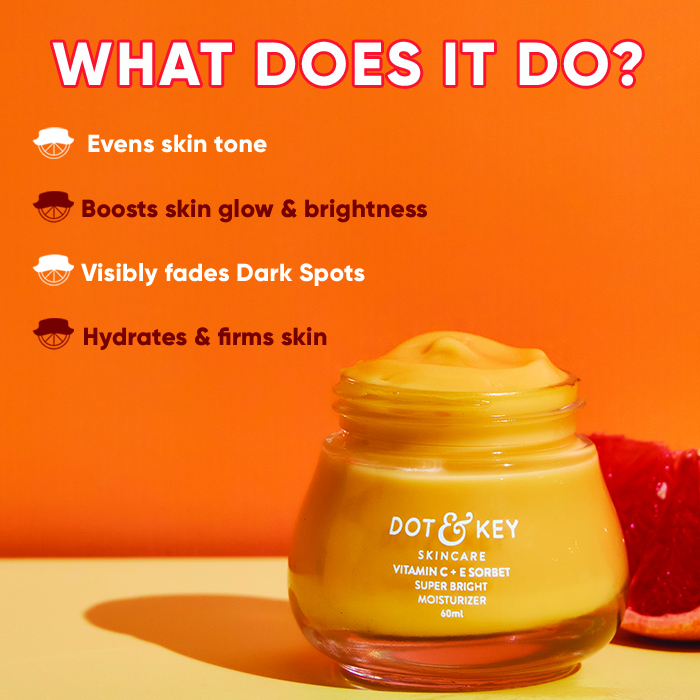 Time to strengthen your glow game! Introducing Dot & Key Vitamin C + E Super Bright Moisturizer, a lightweight, daily face sorbet with 3 types of Vitamin C. The goodness of 100% natural vitamin C from Kakadu Plum, Ethyl Ascorbic Acid and Sodium Ascorbyl Phosphate come together to fade dark spots and hyperpigmentation to reveal an even-toned, bright and glowing complexion. Plus, the additional infusion of Vitamin E and other skin-loving ingredients boosts the potency of vitamin C while protecting skin from external aggressors for a hydrated, firmer skin texture.