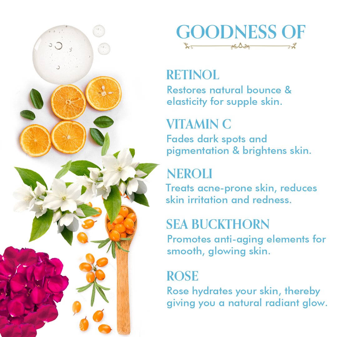 The synergistic blend of Vitamin C & Retinol improves the complexion and makes the skin tone even. Retinol face serum reduces the appearance of fine lines, smoothens crows feet and reduces dark circles. Naturally extracted Retinol in this vitamin c face serum for glowing skin works on fighting hyper pigmentation, blemishes and gives visibly young and clear skin.