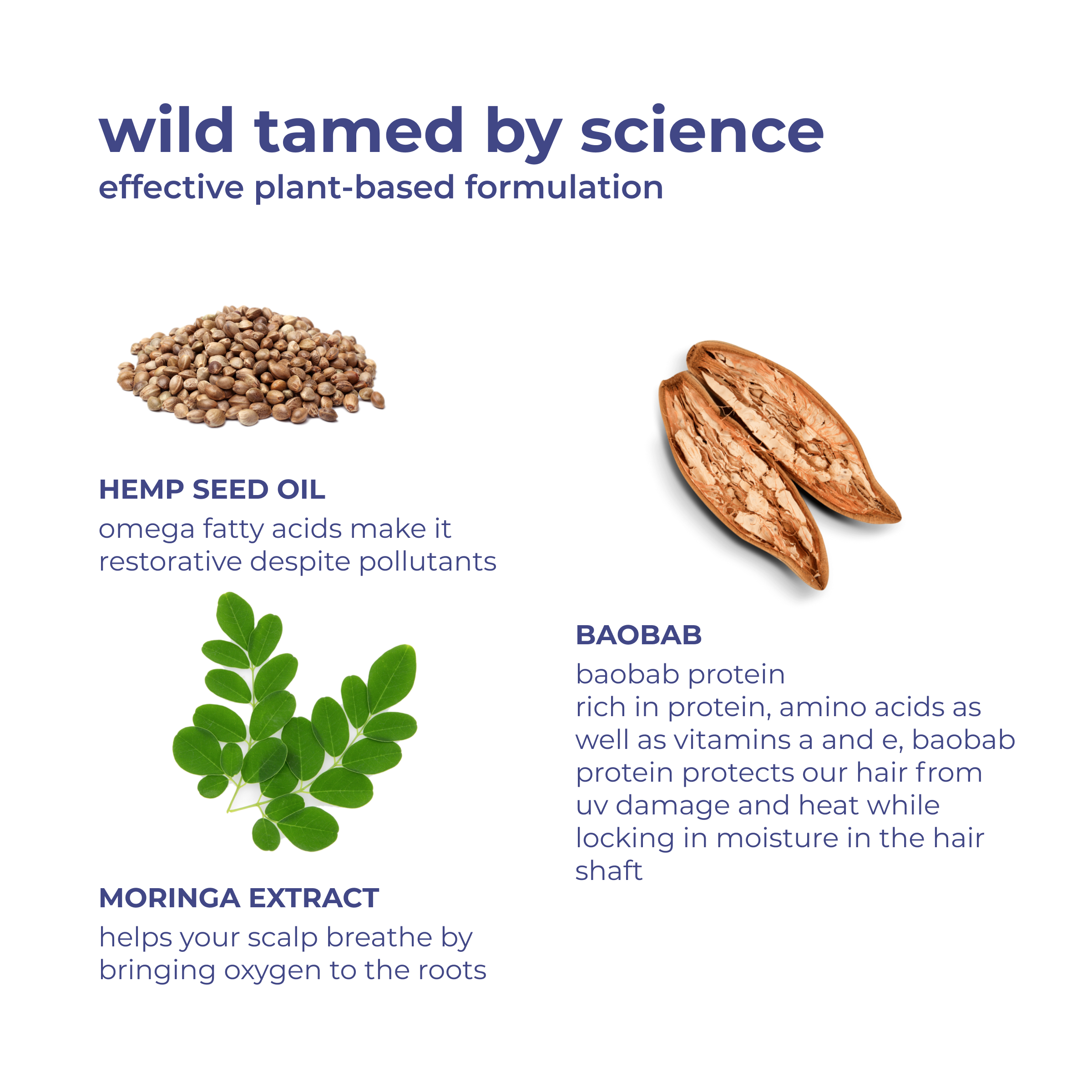 2. Shields from pollution : Beyond repairing the hair barrier, hemp, moringa and baobab create a protective layer to shield our hair from further damage caused by pollution.