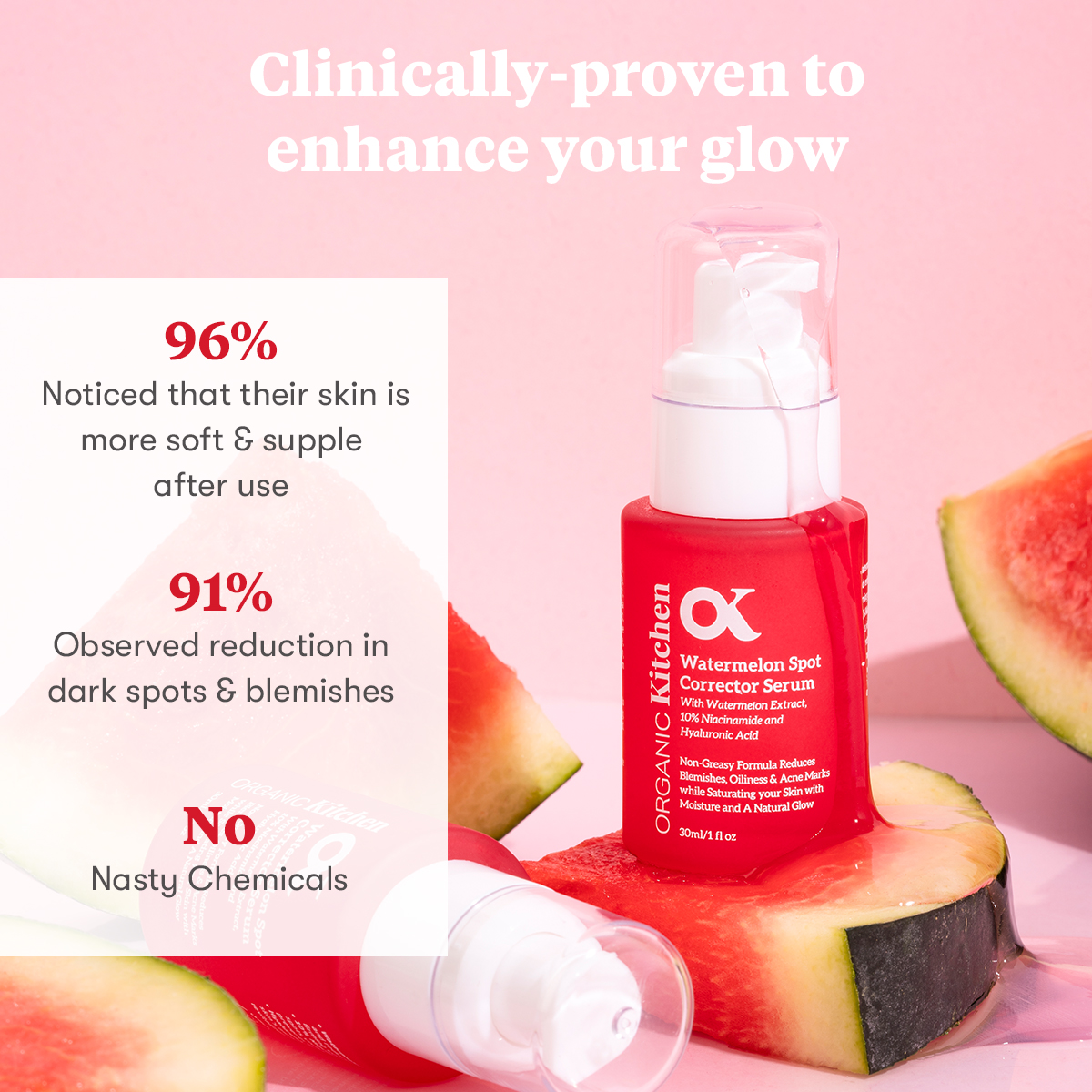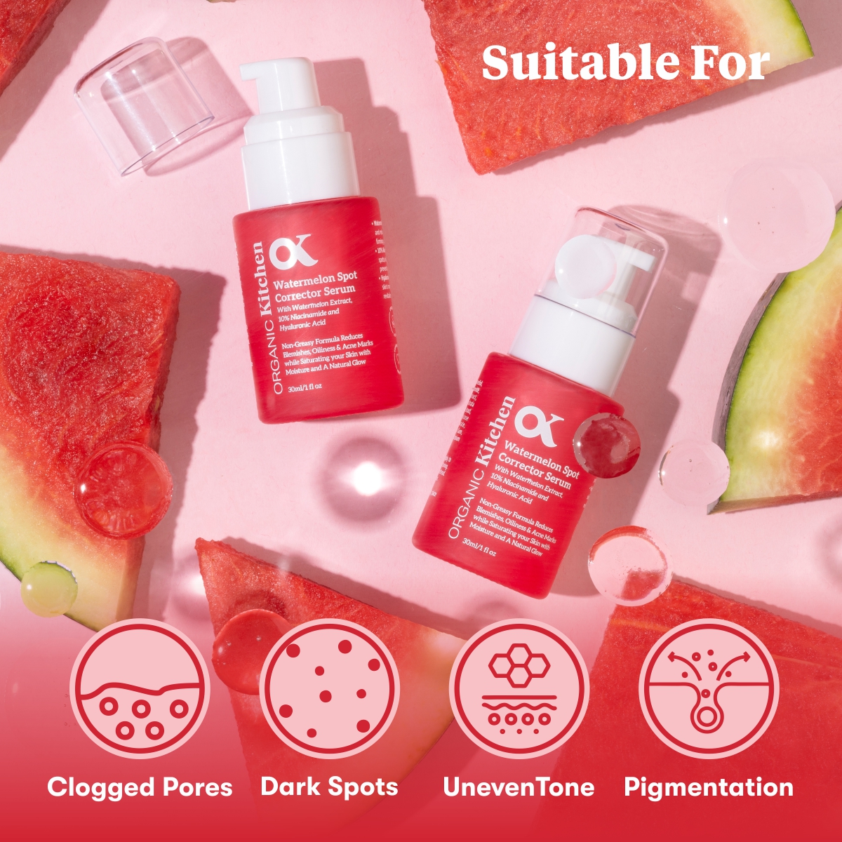 Boost your skin's brightness with the nourishment of Watermelon Spot Corrector Serum. This serum is packed with Watermelon extracts, Hyaluronic acid, and Niacinamide, which provides instant hydration and moisturization to the skin. Watermelon extract helps make the skin look smooth and even-toned by reducing fine lines. Niacinamide minimizes acne while hyaluronic acid helps in keeping the skin hydrated. Get enhanced, glowing skin with this antioxidant-rich Serum.