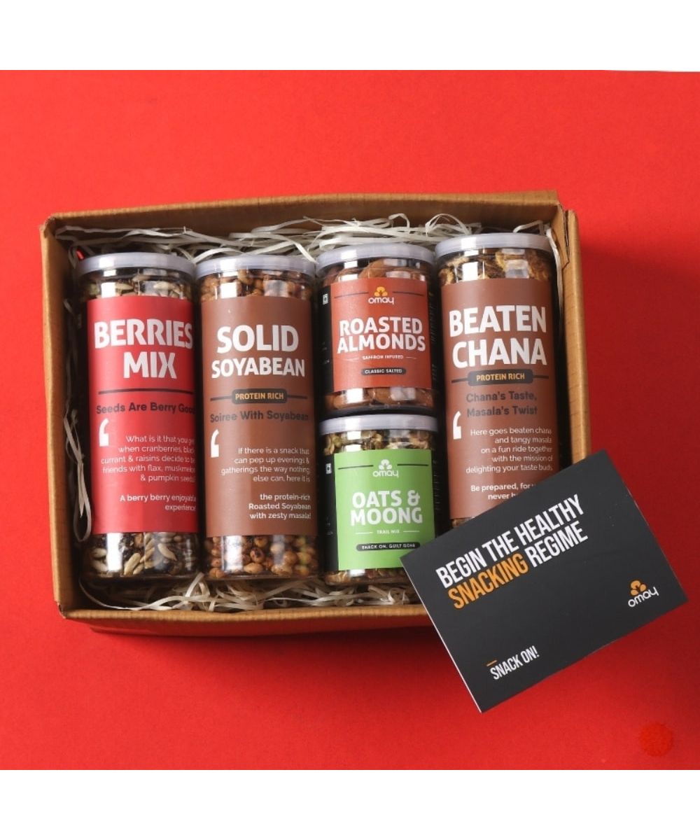 You can now binge on delicious snacks without feeling dreaded by the weighing scale. This Kit consists of everything for your savoury and sweet cravings that you can't resist snacking.Includes: Berries Mix, 185g, Solid Soyabean - Protein-rich, 160g, Beaten Chana - Protein-rich, 160g, Oats & Moong Trail Mix, 75g, Roasted Almonds, 90g.