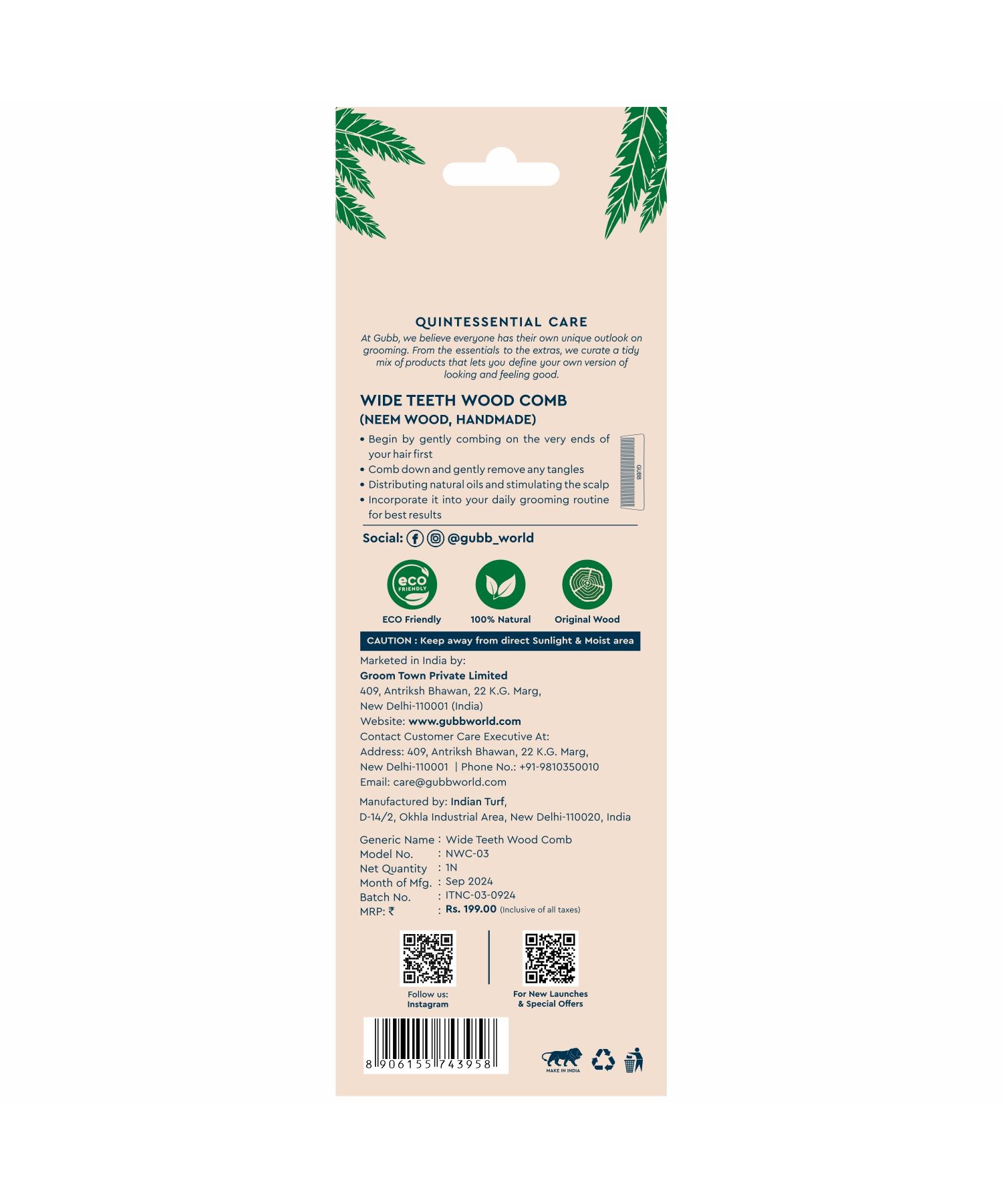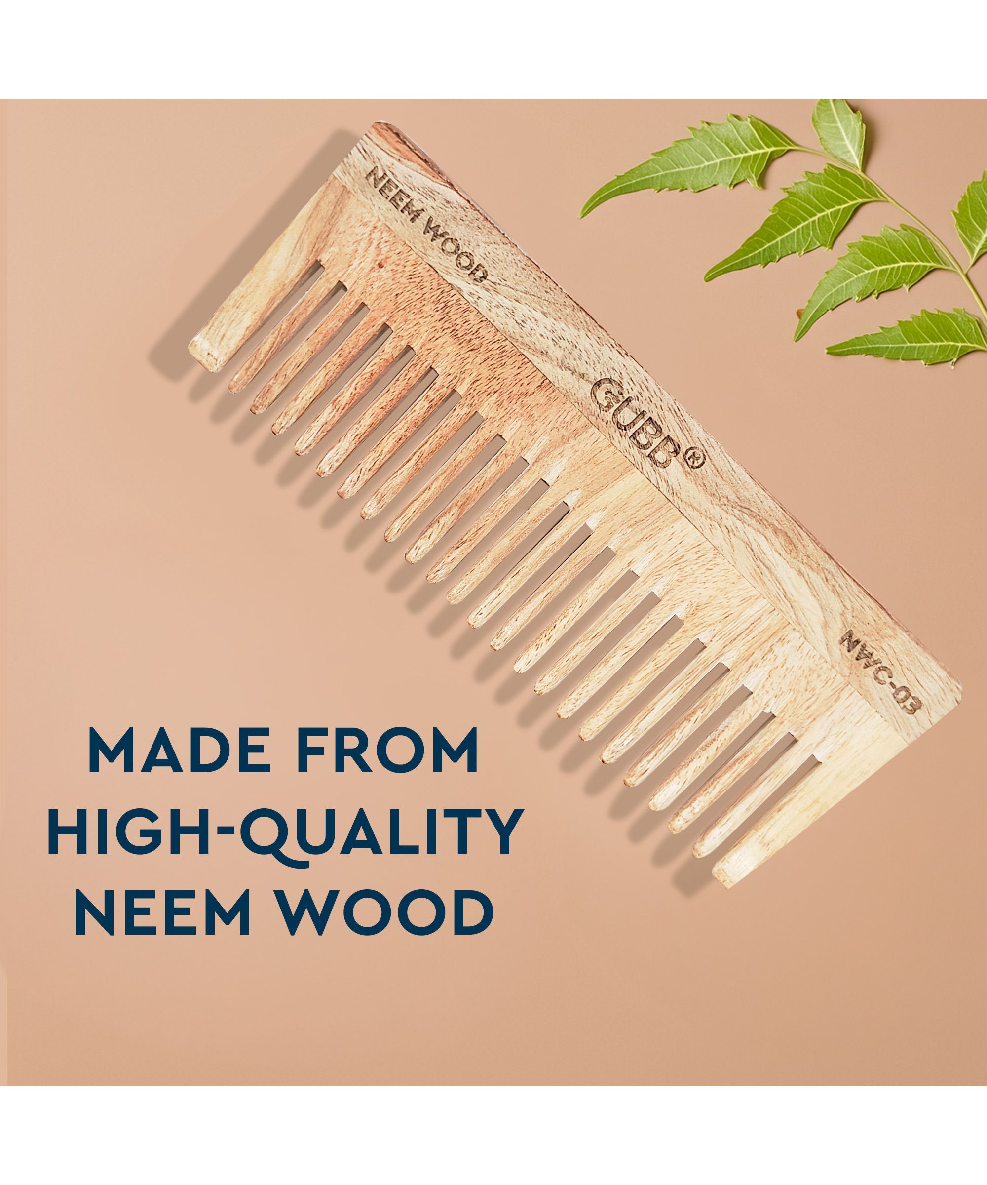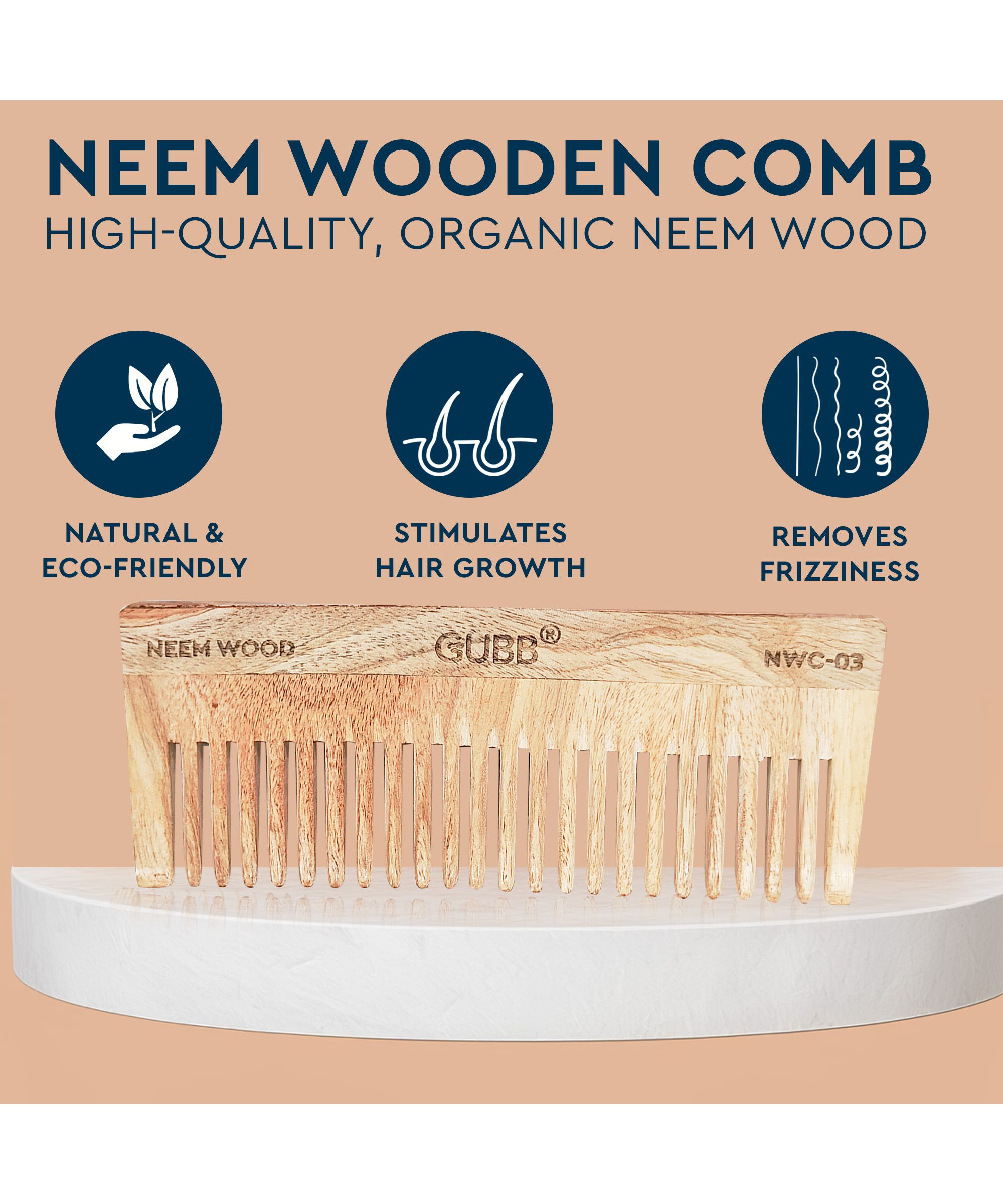 Experience the natural benefits of the GUBB Wide Teeth Neem Wood Comb NWC-03, expertly designed to care for your hair and scalp. Made from 100% natural neem wood, this comb is renowned for its antimicrobial properties, helping to maintain a healthy scalp and prevent dandruff and infections. The wide teeth design is perfect for detangling thick, curly, and wavy hair without causing breakage or discomfort.