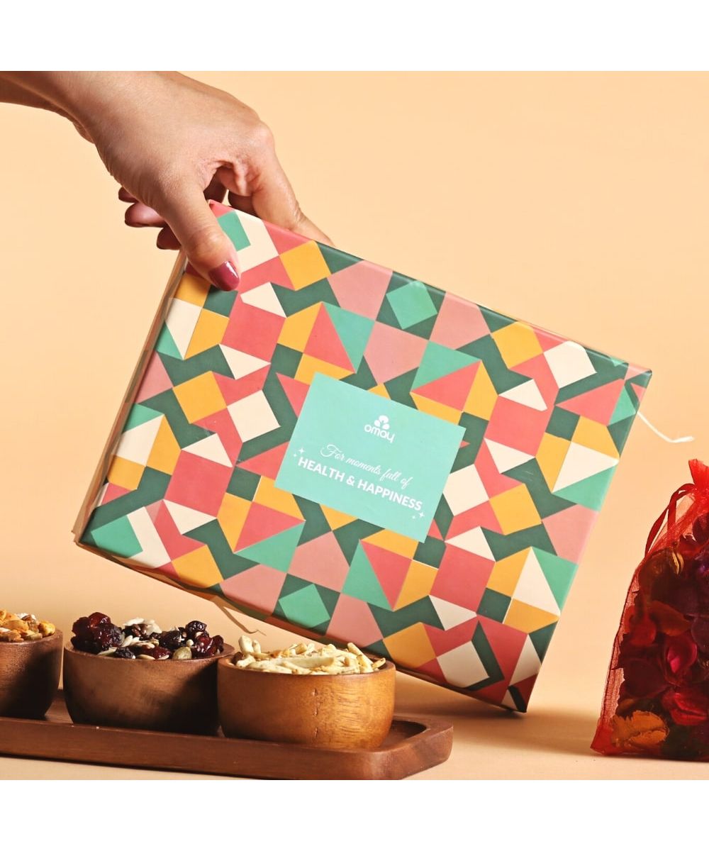 This Omay Foods Gift Box has everything you need to wow your guests and loved ones. Perfect for personal events: weddings, anniveraries, birthday's and corporate events of all kinds: client & employee gifting. Get the best of roasted, non-fried healthy snacks, dry-fruits, wellness teas, decadent chocolates and more; all packed in quirky premium colourful gift boxes.Includes: 1 x Strawberry Blast, 85g, 1 x Navratan Mix, 45g, 1 x Potato Flakes, 20g, 1 x Beaten Chana, 60g, 1 x Loyka's Chocolate Almond Brittle, 1 x Scented Potpurri.