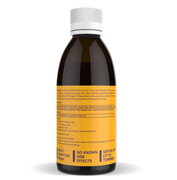 This product is specially-curated for kids. It is a 7 10 days long, double-action, bitter herbs therapy. It eliminates worms and other microorganisms and strengthens the body's ability to expel them naturally to prevent re-infection. It is a purely natural, herbal deworming formula that acts gently without disturbing your kids sensitive tummy.