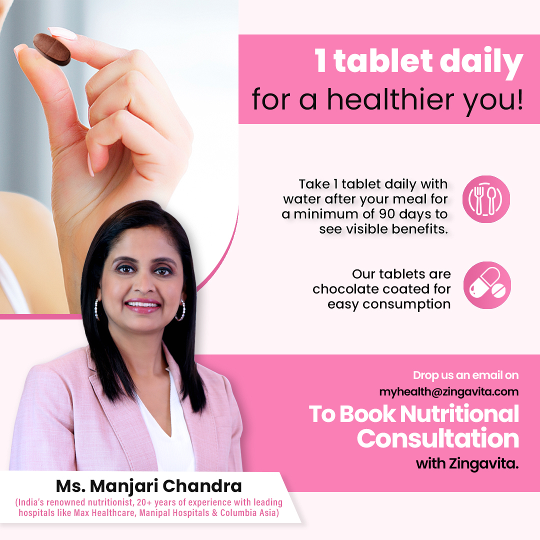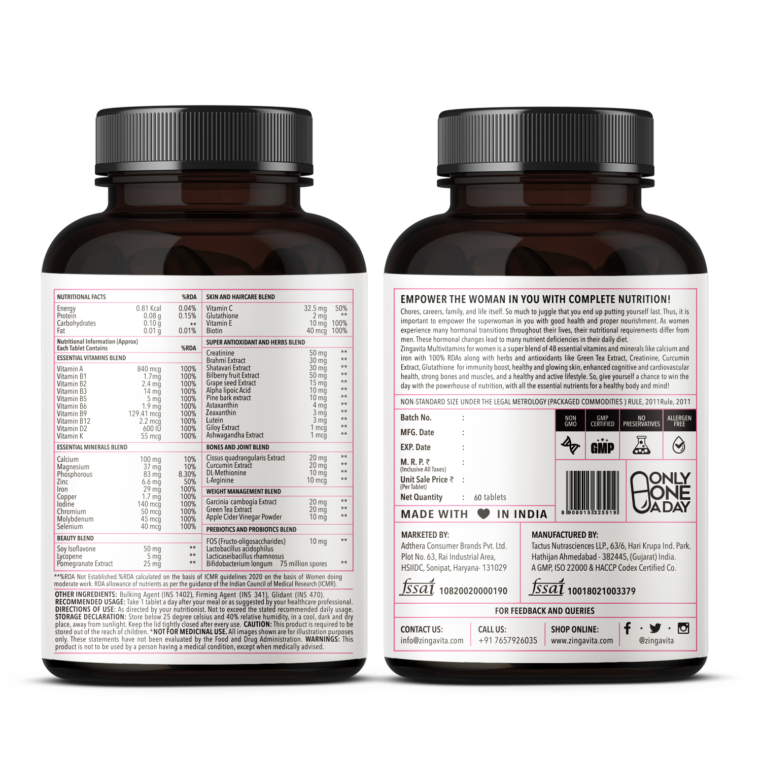 Chores, careers, family, and life itself. So much to juggle that you end up putting yourself last. Thus, it is important to empower the superwoman in you with good health and proper nourishment. As women experience many hormonal transitions throughout their lives, their nutritional requirements differ from men. These hormonal changes lead to many nutrient deficiencies in their daily diet. Zingavita Multivitamins for Women is a super blend of 48 essential vitamins (with 100% RDAs) and minerals like calcium and iron along with herbs and antioxidants like Green Tea Extract, Creatinine, Curcumin Extract, Glutathione for immunity boost, healthy and glowing skin, enhanced cognitive and cardiovascular health, strong bones and muscles, and a healthy and active lifestyle. So, give yourself a chance to win the day with the powerhouse of nutrition, with all the essential nutrients for a healthy body and mind!