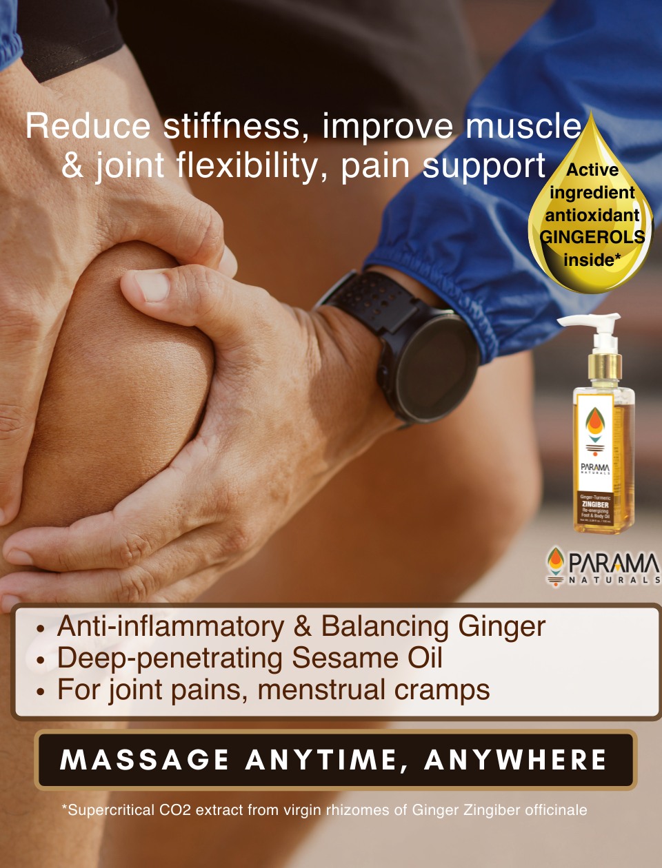 This product is for daily foot and body massage, with circulation-boosting and anti-inflammatory ginger, anti-oxidant and anto-bacterial turmeric and deep-penetrating cold-pressed sesame oil, can be applied post-bath too, suited for all ages, skin and body types. Apply anytime (or post bath) to re-energise and reduce tiredness and lethargy. Massage on pressure points (wrists, temples), neck and shoulder during fatigue, hectic travel, less sleep and on stomach for abdominal pains due to menstrual cramps and gastric discomfort in babies. Massage arms and legs before or after a run, strenuous yoga, dance, or gym work-out for improving joint flexibility, muscle suppleness and on stiff muscles and joints with mild chronic aches. Aids in tackling issues like acne (apply a few drops on inflamed acne, after testing on a small patch) and bruised skin (apply gently avoiding cuts, if any), it is suited for all ages, skin and body types. This handcrafted blend helps relieve stress, stiffness in joints and muscles, boosts circulation. It is best suited pre and post strenuous work-outs, hectic travel, sleep deprivation or for chronic pains and reducing stiffness in joints and muscles.
